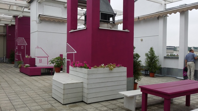 Замечательное место, на мой взгляд, - веранда Дарвиновского музея. Покупаете билет в Выставочные залы Дарвиновского музея (слева от основного здания) и вперед, на 5 этаж. Билеты: для взрослого - 100 р, льготный - 70 р, для дошкольников - бесплатно. С 5 этажа выходите на веранду.
