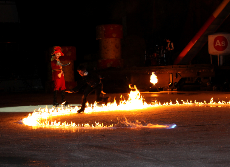 Они на расстоянии вытянутой руки, и запросто могут плюхнуться к тебе на колени, чтобы подурачиться и сделать селфи. Как, например, Алексей Ягудин в роли хулиганистого Мышиного короля. Или взять и взлететь под потолок, держась на одной руке, как тоненькая хрупкая Татьяна Тотьмянина в роли Мари. А её постоянный спутник Максим Маринин - интеллигентный, но бесстрашный Щелкунчик - победить зло взмахом горящего меча, от которого лёд полыхает, как в голливудском фильме.