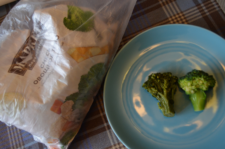 Запасов заморозки было много, но последняя от Маркета меня просто убила. Смотрите фото. Рядом (справа на тарелке) брокколи, которое я купила на рынке, помыла, разделила на соцветия и заморозила сама.