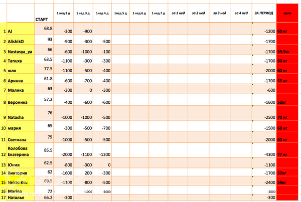 Маша, я схожу с дистанции... мне тут умные люди посоветовали не сидеть на диетах, от них только замедляется обмен веществ и в результате мы только будем набирать вес... буду просто стараться грамотно и правильно питаться и наверно пойду в тренажерку.... не так много у меня лишнего веса, мне поможет только спорт, подтянусь и буду красивая... А вам всем удачи, буду следить за вами )))))
