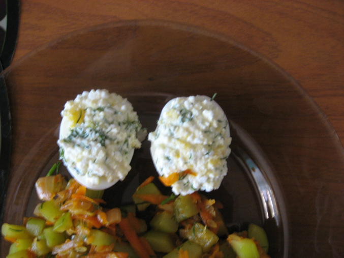 Рецепты диеты:)Сегодня пообедала ОЧЕНЬ вкусно и спешу с вами поделиться)))) Незнаю, может такой рецепт уже есть, не стала искать. Ну так вот. Я сегодня ела тушеные кабачки с фаршированными яйцами. Ну в тушеных кабачках ничего особенного нет, а яйца я так приготовила. Отварила вкрутую, разрезала на пополам. Соединила 5% зерненый творог с желтком, укропом и чесноком. Вилкой размяла в однородную массу и нафаршировала этой начинкой яйца. Было очень вкусно.