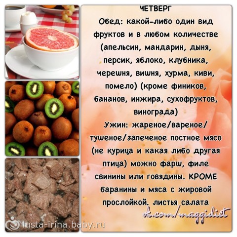 Обед: какой-либо один вид фруктов и в любом количестве (апельсины, яблоки, груши, абрикосы, дыни, арбузы и т.д.)
