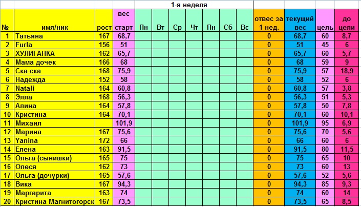 Дневник худеющей:)Девчоночки привет! За понедельник отвесики пишем сюда, не забываем писать номер свой в табличке и отвесик! Думаю у многих первый день прошел тяжеловато, если уж совсем невтерпеж съешьте огурец или морковь, и не забывайте про воду! У меня день прошел хорошо, только после обеда голова разболелась, и до сих пор болит, думаю вчера на земле вечером пересидела балда(. Сегодня весь вечер мужу вкусняшки готовила, ничего не попробовала, но пахло вкусно)).