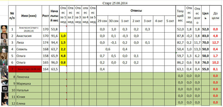 Зелененьким отмечены девочки, которые стартуют с понедельника:) В нашем полку прибыло:)