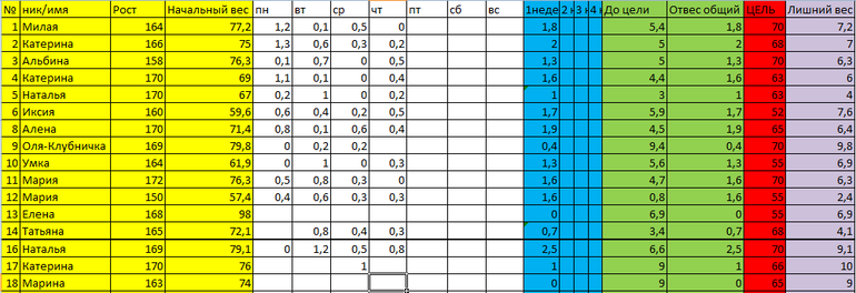 Юля, привет! В табличке не хватает графы "текущий вес". Память подводит, могу не вспомнить, сколько вчера весила