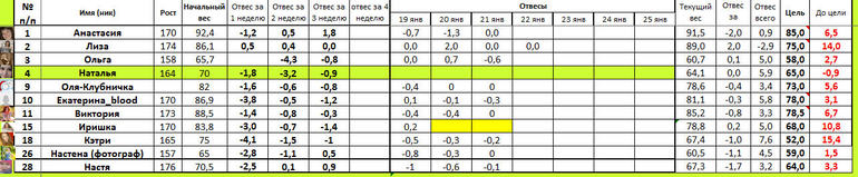 у меня +100гр, вес 60,6Я точно иду дальше! Видела набор на Магги с понедельника, мне туда подключаться нет смысла, хочу с вами и дальше! Может мы будем раз в неделю отчитываться? В пятницу! А то в понедельник не самый лучший вариант, в выходные вечно что-то съешь, воду задержит и в понедельник не такой хороший результат=)