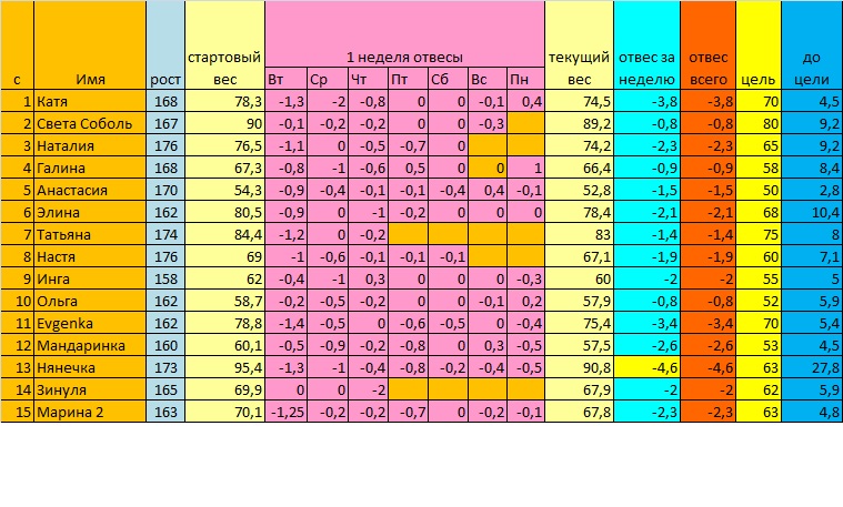 Подвела итоги в табличке, наш лидер по сбросу веса за недельку - Нянечка))) Поздравляем))