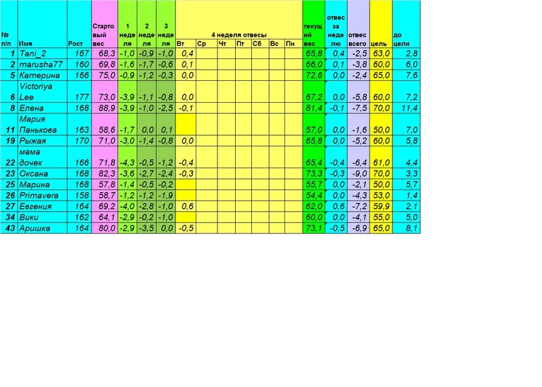 Доброе утро. Тань, да, очень жалко, что нас осталось так мало, лично я на диете первый раз и держусь на 50% именно потому, что худею вместе с компанией, очень хорошо мотивирует, а 50% — это мой настрой. Лично я после этого круга неделю отдохну (постараюсь особо не сорваться) и на второй круг. Хочу быть стройной и красивой!!!!!! №8 отвес -0,2 кг вес 81,2.
