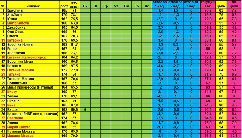 Красным выделила кто не отчитывался на прошлой недели, последний раз спрашиваю))), кто не отпишится сегодня удаляю!