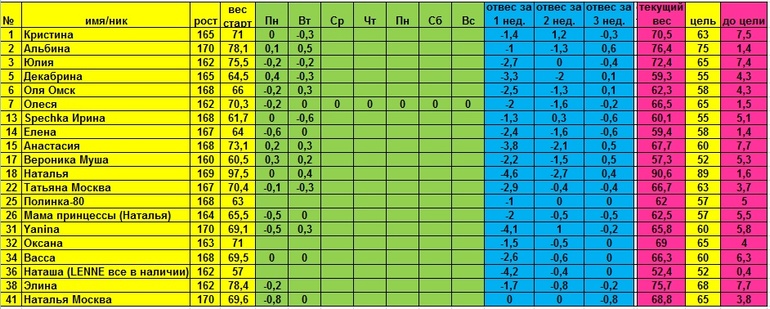 Доброе утро, худышки)) У меня сегодня -0,500 (№ 41), вес 68,3. Ура ура, хоть какой-то сдвиг начался. Главное не сорваться и не накосячить в выходные, завтра на работе мужчинам устраиваем праздник, будут блины с икрой, вот думаю как же мне завтра удержаться.