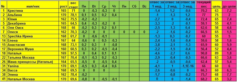 Всем приветик!№ 18, отвес -1,3 кг, текущий 88,7Сама не ожидала! Прямо испытала шок и взвесилась три раза. Хороших выходных!