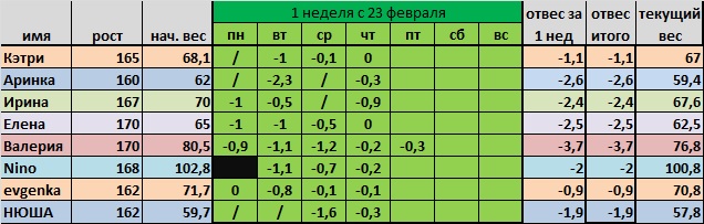 - 7,1)вот думаю на втором круге точно жирочек уходит, поэтому так медленно)2 года назад в первом круге ушло — 9,9, но там был спорт, бассейн, велотренажер) там мы с Кэтри и познакомились, и в троем с еще одной девочкой из 25 человек дошли до конца)))