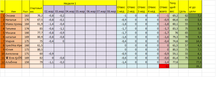Ну и наша табличка, девочки за 2 дня мы с вами избавились от 12 кг!!!!!
