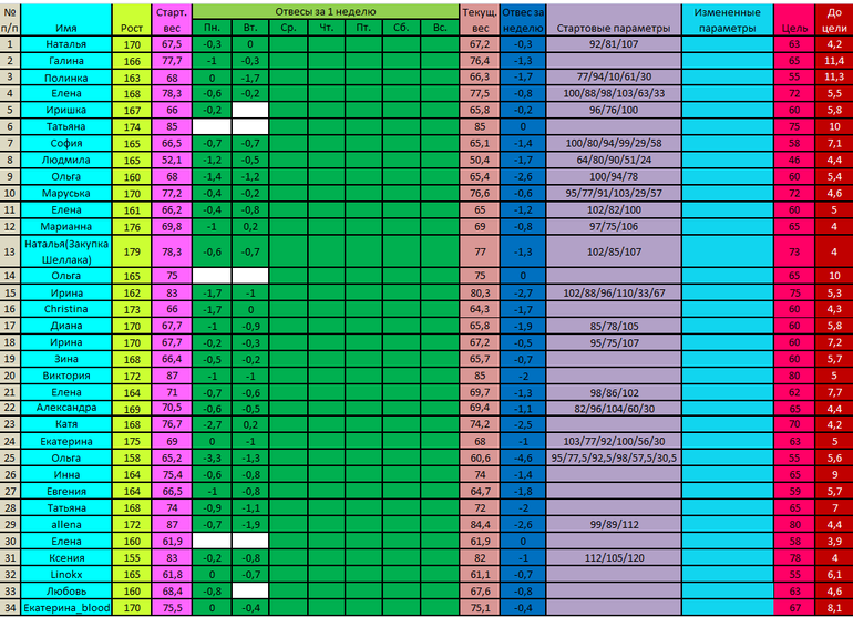 Наши отчеты и результаты:)Привет, девочки! Опять пишу с вечера, если вы не против, всегда так буду делать. Наши ряды начали редеть, уже завтра эти девочки будут исключаться из наших рядов!Традиционно мотивация, меню и исправленная табличка. Отдельное спасибо Елене за внимательность.