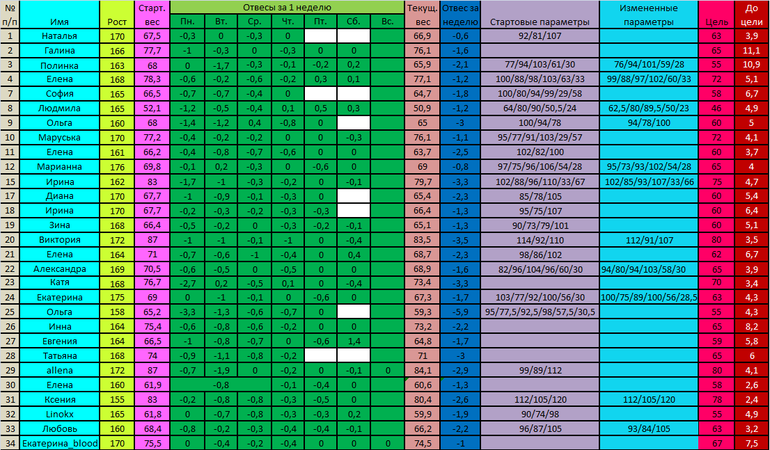 Наши отчеты и результаты:)Привет, мои хорошие! Как дела, как прошли выходные? Многие не отчитались, вы еще в строю? Сегодня у нас еще -1 девочка, но это выбор каждого. Начинаем вторую неделю к нашей стройности, эта неделя совсем яичная будет, но зато на следующей отдохнем. Держимся, девочки, держимся!!!!