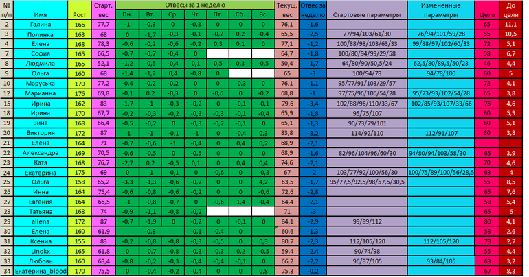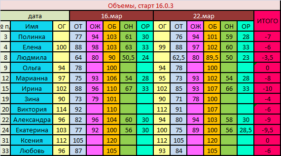 Сегодня вам сброшу табличку с объемами отдельно от основной таблички, так удобней и объемы буду вам сбрасывать раз в неделю, проверяйте, в эту табличку внесла только тех девочек, которые дали данные за 2 недели.