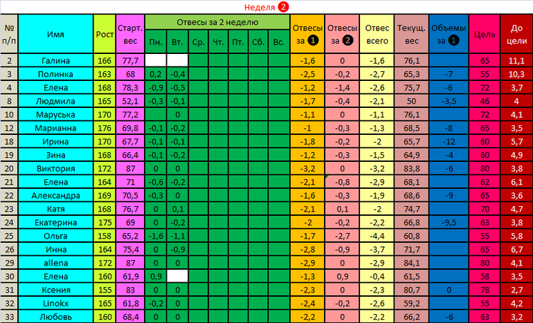 И еще я сегодня разговаривала с девочкой, которая сидела на маги и сбросила 8 кг, начальный вес у нее был 70-75, точно не помнит, так вот у нее вес стоял с первого дня, но объемы уходили, начал вес уходить только в середине 3 недели.