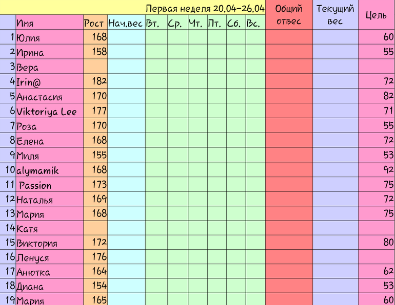 Наши отчеты и результаты:)Всем доброе утро девочки! Сегодня мы начинаем наш не легкий путь к стройности, ведь как всем известно "Нет ничего тяжелее, чем стать легче". Вместе у нас все получится! Итак. Те кто уже есть в табличке, пишите свой стартовый вес. Кого нет, но хотели бы присоединиться, пишите : рост , стартовый вес, желаемый вес..