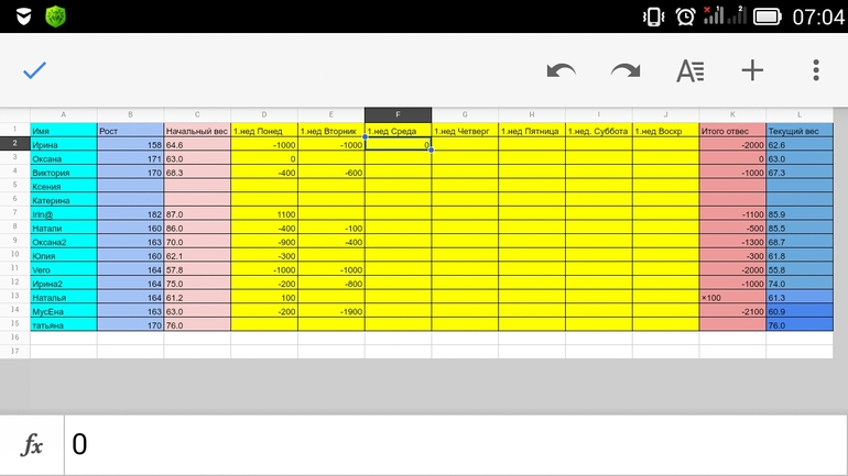 У меня (№7) за вторник (в таблице почему-то нет) — 900 , а за среду — 100 = итого текущий вес 84,9 кг.