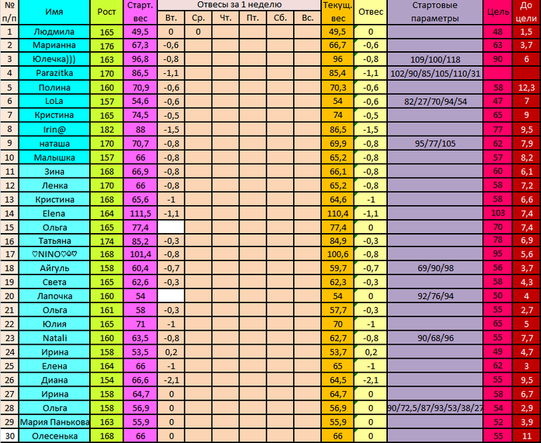 Здравтсвуйте, Людмила, а можно мне к вам присоединиться.. начала тоже с понедельника. Мой начальный вес 55,800, рост 160. во вторник — 55,100 (-0,700), сегодня (среда) — 54,700 (-0,400). Впишите, пожалуйста в табличку, если можно :) Цель — 50 кг. Спасибо!!!