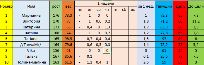 Номер 1, вес 70,8. -1,5 кг. В след. раз взвешусь в Пн! Надеюсь выходные не сломят меня)