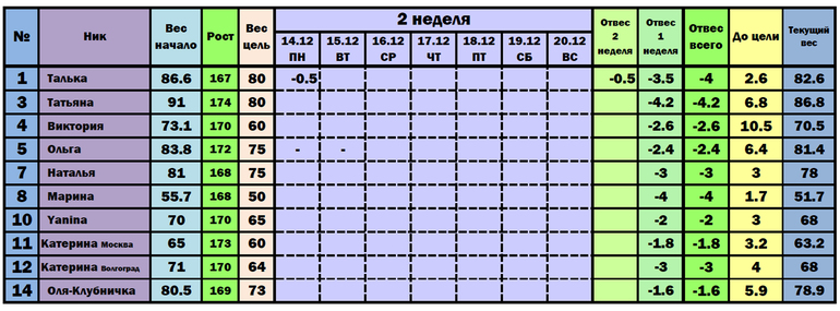 В лидерах Татьяна и Марина, наши рекордсменки!))) Все умницы-разумницы, не останавливаемся, не забываем, для чего мы всё это делаем, и Новый Год встретим похудевшими красотками!)