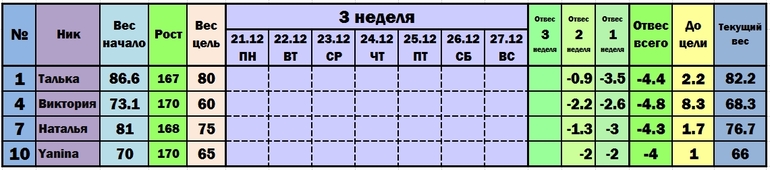 Табличку можно будет продолжить на эти дни, если у вас будет желание отчитываться) Я с удовольствием.. А ещееее, после НГ, скорее всего с 11 января я буду начинать новый круг, если будет желание, то имейте ввиду))