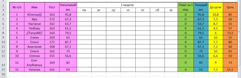 Наши отчеты и результаты:)Девочки, привет! Проверьте свои данные в табличке. В комментариях пишем отвес за первый день, текущий вес..