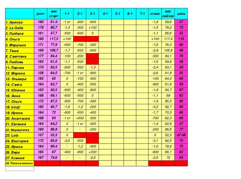 Добрый день. Номер 15, сегодня -800, вес 90,7. Арин, исправь у меня вчера текущий 91,5, а в табличке 90,9. Видно по считалось неправильно. И ещё я хотела спросить а не удобней таблицы которые ты вечером вставляешь в утренний пост вставлять? Так бы мы уже в этом посте видели какой отвес до сегодняшнего дня?