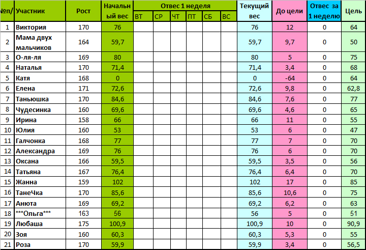 Всех прошу отписаться кто с нами - вес, рост, цель и отметьте как часто вы будете отчитываться. ежедневно или раз в неделю чтобы я вас не теряла.