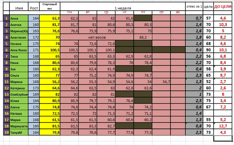 Наши отчеты и результаты:)Всем доброе утро!!! Пока у Катерины нет доступа к компьютеру я буду вести табличку.