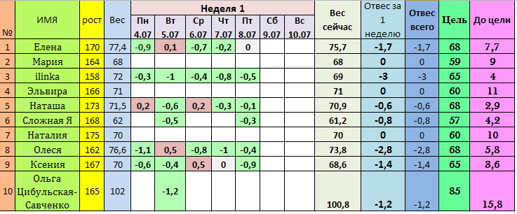 Табличка: на сегодня лидирует ilinka (-3 кг), чуть отстает Олеся (-2,8) - девчонки, МОЛОДЦЫ!!! Так держать!