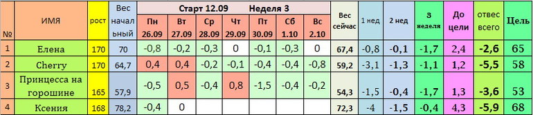 Вот и прошли 3 недели, Ксения у нас болела, поэтому ее результат на сегодня мы не знаем, но за 3 недели она скинула 5,9 кг, на втором месте Cherry с результатом - 5,5 кг, на третьем Принцесса на горошине с результатом - 3,6 кг! Молодцы, девчонки, не расслабляемся и показываем максимум на этой неделе!!! Я со своим скромным, но все-таки результатом, замыкаю нашу 4-ку с результатом - 2,6 кг!