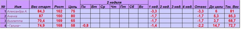 Наши отчеты и результаты:)Доброе утречко, товарищи худеющие! Я скинула 800 г, но кажется маловато, на прошлой неделе побольше теряла, наверное из-за фруктовых обедов)) Настроение отличное, кучу дел вчера переделала, сегодня занимаюсь только детьми и собой))