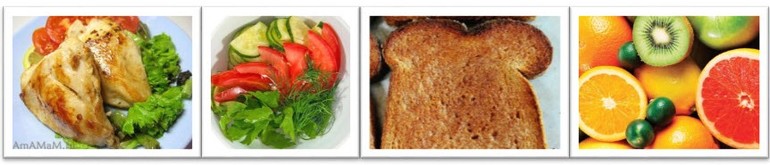 1/2 вареной или жареной курицы, 3 помидора, огурец, 1 тост, 1 апельсин или грейпфрут. Один вид из ранее перечисленных фруктов.![]()