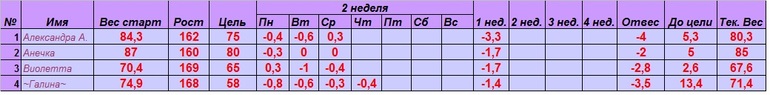 Следующая неделя у нас вообще ответственная: лишняя жидкость из нас вышла, начнёт жир уходить. Так что готовимся и не падаем духом! Ох, даже не знаю смолга бы я вести табличку, если б нас было больше))