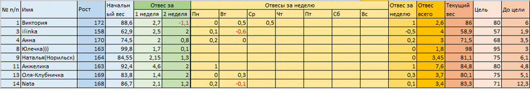 Доброе утро мои красавицы!!!! В среду не взвесилась потому что проспали... автоматически выключила будильник и очнулась уже в 7-30.... с криками мы проспаааааааалллиииии...... начала судорожно собирать детей и себя....но вечером меня ждал сюрприз... ко мне приехали подруги с другого города.... мы не виделись около 2 лет... подождали меня с работы... и мы поехали ко мне... было пиво, рыба, чипсы, долгие разговоры почти до утра, и масса положительных эмоций.... короче девочки... эти 2,5 недели были косяковые потому что праздничные... я Вас оставляю так как с понедельника на 1 неделю..... только теперь без косяков....