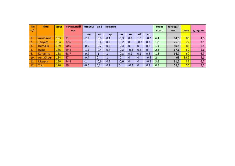 Наши отчеты и результаты:)Доброе утро девочки!!! Ну все... можно выдохнуть спокойно выходные прошли и постепенно привыкаешь к питанию снова... много писать не буду.. дел очень много сегодня родители в гости приезжают... нужно и покушать наготовить и в квартире прибрать.. и на работу вызвали несмотря на отпуск(((( так что смотрите таблицу и проверьте... вдруг накосячила)))