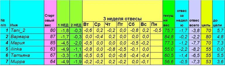 Девочки, спасибо вам за поддержку и за компанию! Танюша, спасибо,что эти 3 недели нас вдохновляешь своими постами и что ведешь таблички!!!😘😘Даже не верится,что я столько сбросила уже! Одежда уже свободно на мне висит,раньше в обтяжку прям было.