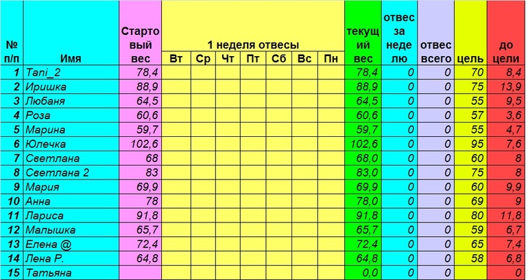 Я под номером 15. Пока не вижу свои данные сначала. Напомню вес 63. Желаю 55 кг :)