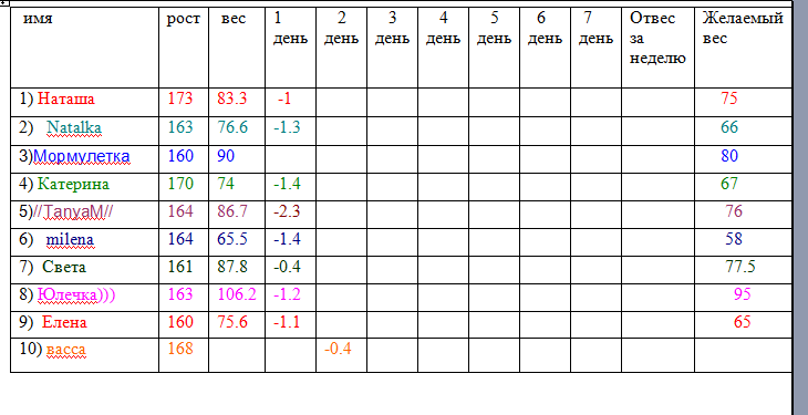 Если кто-то сорвался-не стесняемся признаться в этом и написать,чтобы я вычеркнула из таблички,ничего,со всеми бывает)))