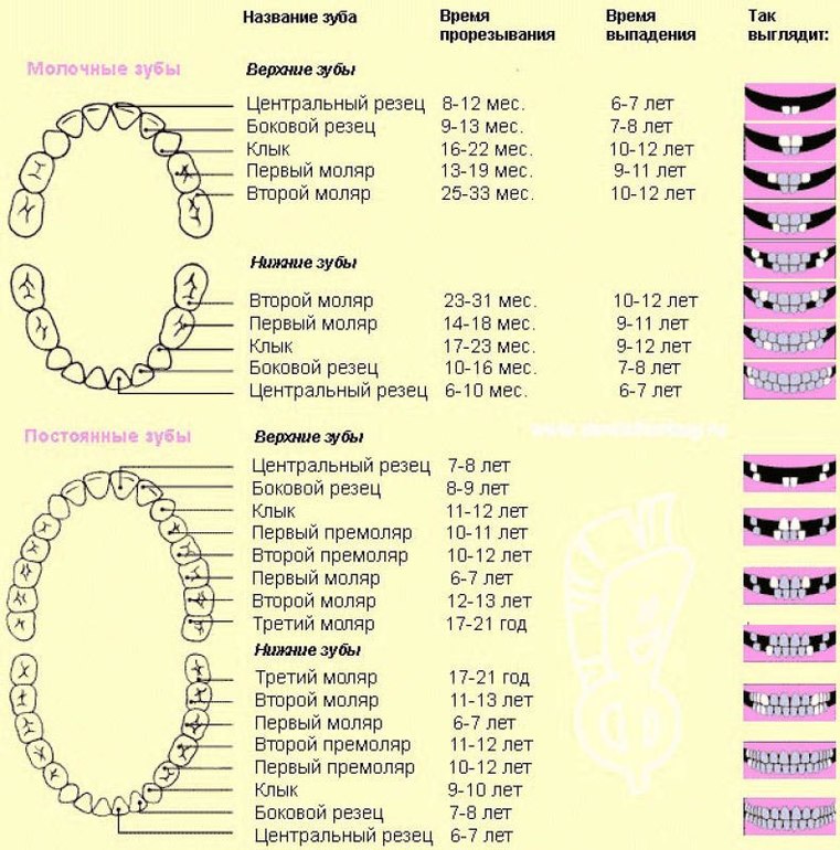 К 6-7 годам эти зубы начинают прорезываться. Этот процесс сопровождается рассасыванием корней молочных зубов. От этого молочные зубы расшатываются. Когда укороченный корень больше не может удерживать молочный зуб в лунке, он выпадает. Так постепенно, один за другим, молочные зубы выпадают, освобождая место постоянным. Смена молочных зубов постоянными обычно заканчивается к 12-13 годам.