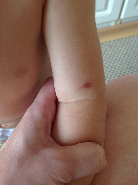 Неа не. Ели, и сначала было белым как после укуса, вскочило на даче так что думаю вероятнее укус, мокнет немного, седня уже посуше болячка, добавила последнее фото только что сделано, на аллергию не похоже поэтому и заволновалась, ну совсем не такое, у нас на этой же руке аллергичные пятнышки бывают щас немного прошли а так есть но это совсем другое. Позвонила педиатру сказал не водноваться и помазать фенистилом и внутрь тоже.
