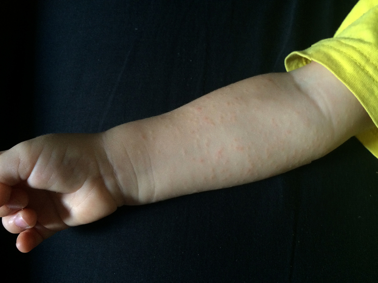 Высыпания на кожеДевочки, как думаете, что это может быть? Бесцветная сыпь, в основном на ручках и плечах, ребенка не беспокоит, других признаков никаких.