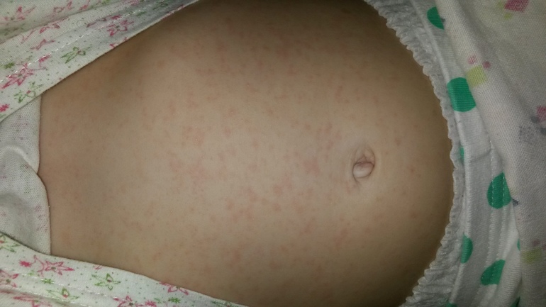 Сначала на животике,потом перешла на спину. На утро второго дня появилась немного на шее и на лице. Вечером спустилась в пах. На руках,ногах нет. В общей сложности сыпь уже 2 дня. Читала что это может быть розеола. По симптомам похожа.