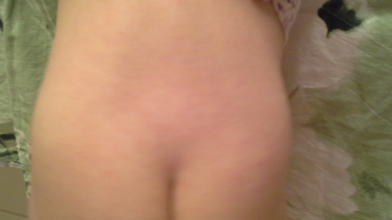 У дочки 3 дня была температура 38,5-39. Потом сразу появилась сыпь. В первый день сыпь была на спине,животе, руках.На 2 день осталось немного на пояснице (фото) и на лице около ушей и на лбу.