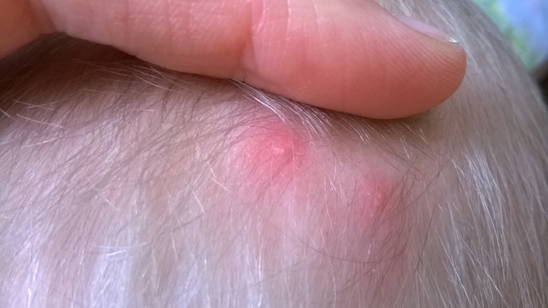 Высыпания на кожеДевочки, всем привет! У сына позавчера появилось на голове красное пятно, а внутри как будто прыщик, думала комар может укусил(у нас их сейчас полно на улице), вчера на голове добавилось еще 5 таких же красных пятен с прыщиком внутри, они очень твердые на ощупь(прям бугорки). Сегодня вроде новых не добавилось.