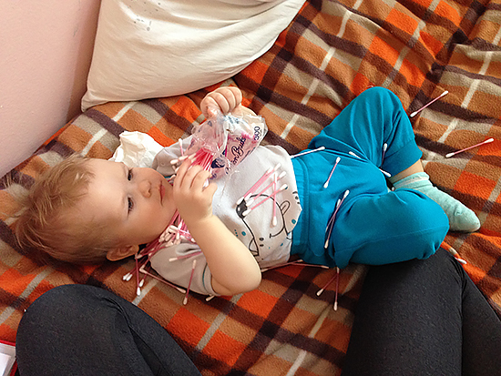 Все игрушки ему надоели, так что мы стали пускать в ход ватные палочки, мои конфеты, даже кусочки рафинада))