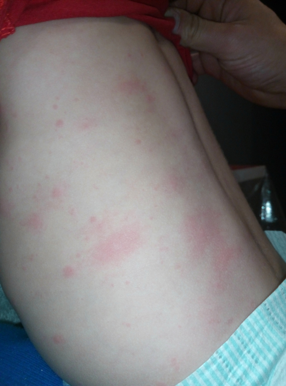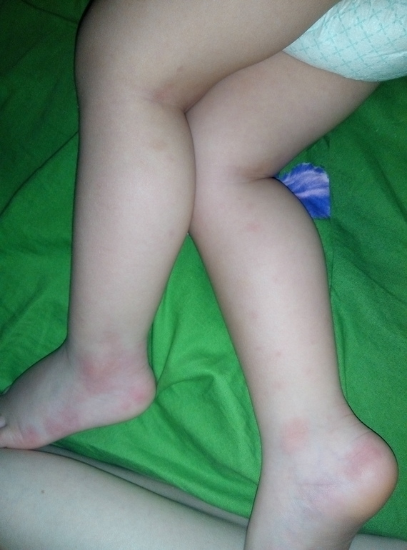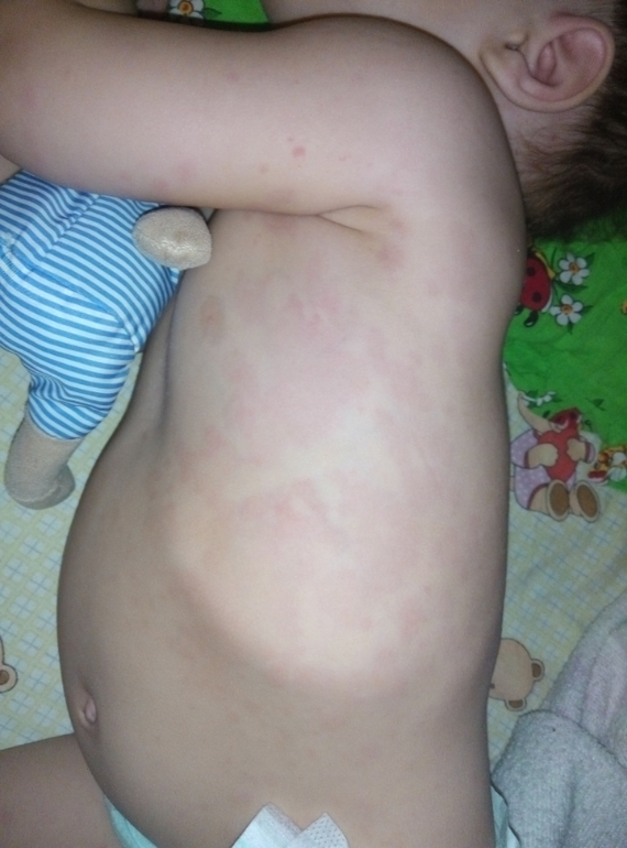 Вёл он себя как обычно, никак не реагируя ни на сыпь, ни на температуру. Мы даже сходили поздравить деда с днюхой, в соседний дом. Пятна к вечеру становятся ярче и больше, сливаясь в огромное пятно. Как-то тревожно... Переписываюсь с аллергологом (он не в городе), говорит что нужен укол преднизалона или дексаменатоза и поменять зиртек на ксизал. Темп 37.9. Вызываю скорую, колят преднизалон, ждут вместе с нами, сынок скачет и прыгает, как ни в чем не бывало. Эффекта нет, сказали действие через 15 мин. Советуют подождать час и ехать в больницу. Такие пятна были и на спинке, и на попе и на ножках. Казалось что кожа стала реагировать на прикосновения, на левой стороне рассматривали вместе с врачами скорой синие пятна, решили что то от пальцев, когда держали, делая укол.