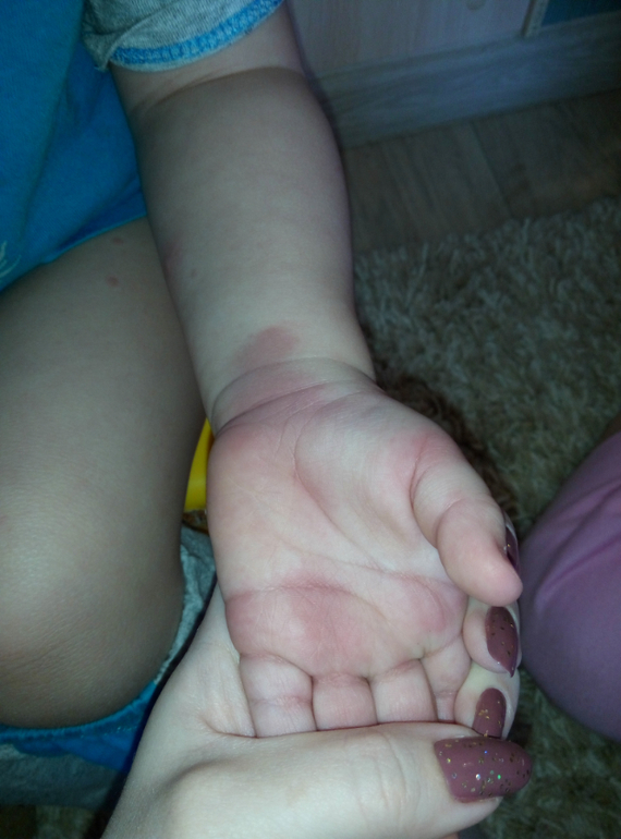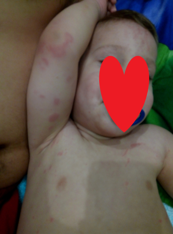 День 3й. Суббота. Темп. 37.4. Пятна пошли на затылок, шею, ушки, ладошки, стопы. Т.е. каждый раз в новых местах, исчезая с предыдущих. На затылке у сыночка родовое пятно, вот оно его жутко беспокоило, стало очень красным, его он постоянно чесал. На всё остальное не реагировал никак. Вызвала дежурного врача. Сказала что точно аллергия, уколоть однократно супрастин, продолжить зиртек. Помочь должно. Укололи. подождали. Результата нет... Кстати, хрипы резко исчезли, в пятницу были, в субботу уже нет.